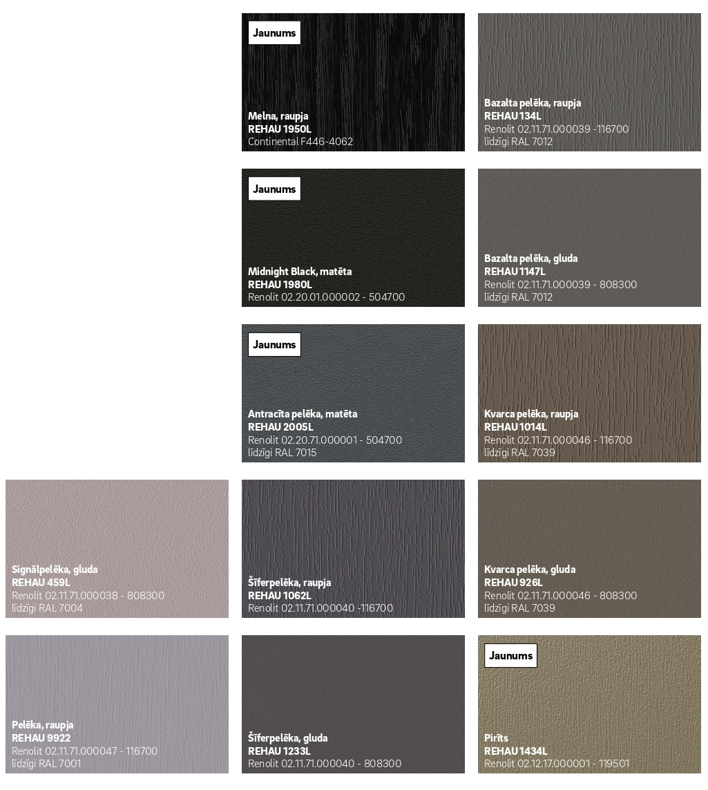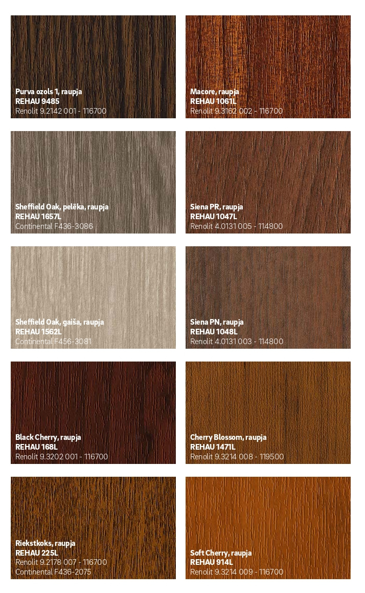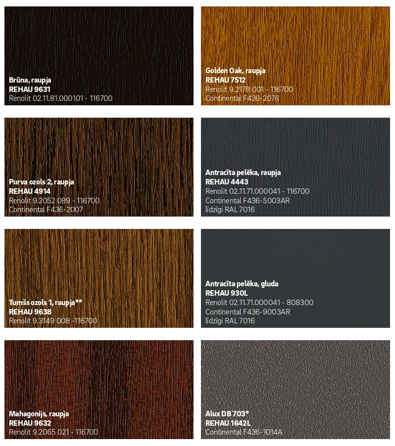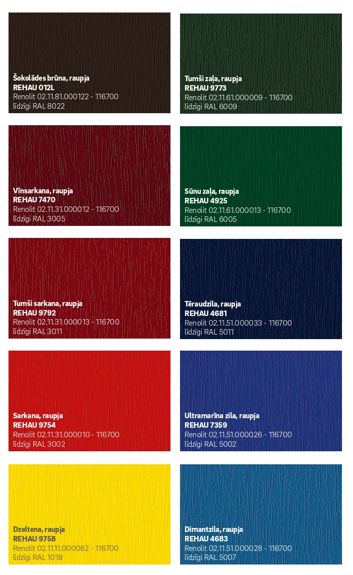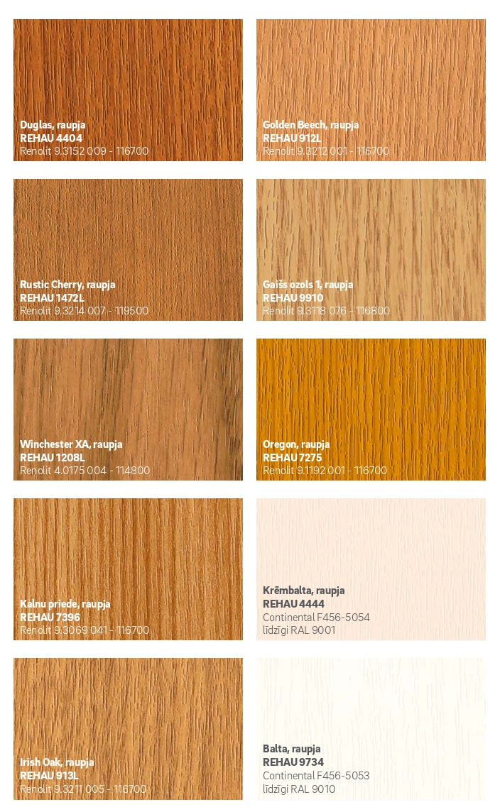 100 % REHAU kvalitāte – pārliecinošs un pareizs lēmums jauni logi un durvis ir investīcija nākotnei. Mēs gādājam par to, lai Jūs arī pēc daudziem gadiem par mūsu logiem priecātos tāpat kā pirmajā dienā. Par krāsu izvēli nevajag bažīties, REHAU kvalitātei atbilst tikai tādi materiāli, kas veiksmīgi iztur visas pārbaudes. Tas ļauj garantēt krāsas saķeri ar virsmu un ilgtermiņa noturību.